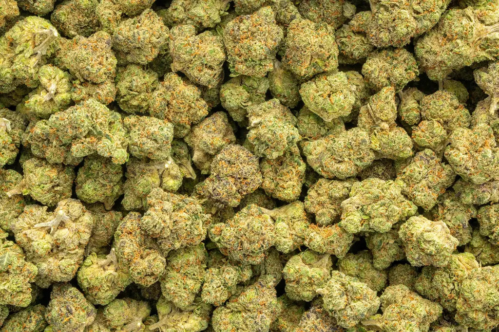 Visually, the buds are dense and chunky, slathered in a thick carpet of sparkling crystalline trichomes. Their coloration often features forest greens with hints of lime and purple blush, threaded with bright orange pistils, and the sticky, resinous finish gives them a glossy, sugar-dusted look.