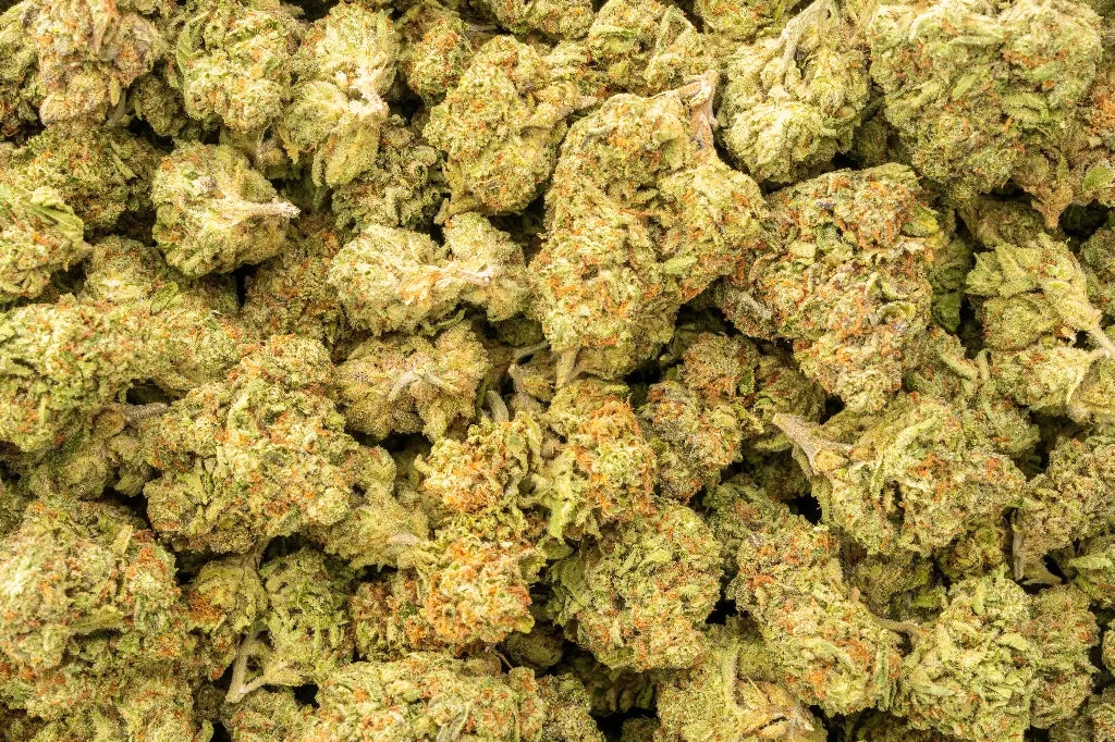 Visually, the buds are dense and chunky, heavily frosted in glittering crystalline trichomes. Their coloration typically presents minty to forest greens with darker undertones, occasionally showing faint purple accents and threaded with fiery orange pistils, while the resinous sheen gives them strong bag appeal.