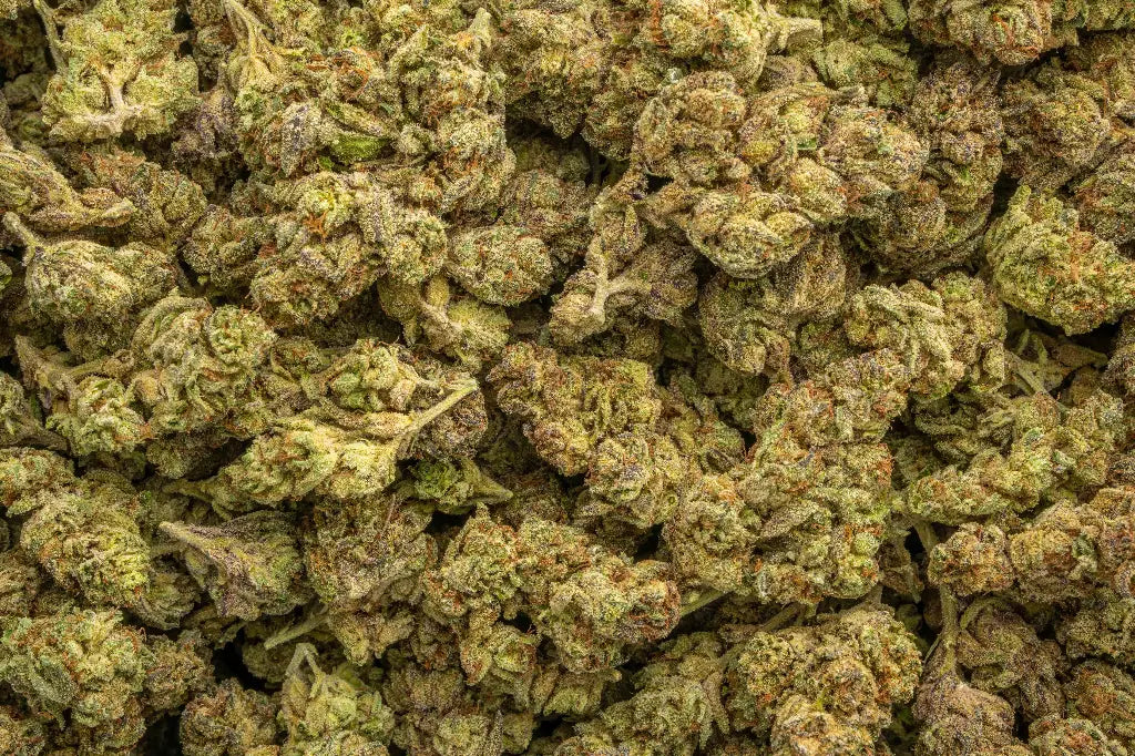 Visually, the buds are dense and resinous, coated in a thick layer of milky and amber trichomes. Their coloration often features vibrant forest greens with occasional purple accents, interlaced with bright orange pistils, and the sticky, glossy finish enhances their sensory appeal.