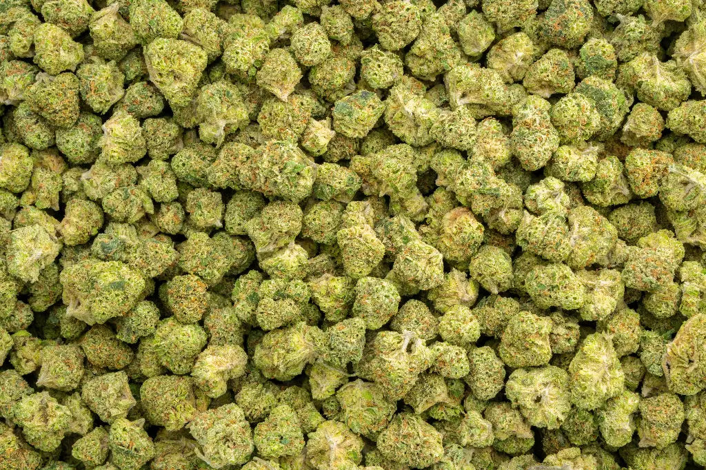 Visually, the buds are dense and chunky, blanketed in thick, frosty trichomes that shimmer. Their coloration often presents forest to lime greens with occasional purple shadows, interlaced with bright orange pistils, and the sticky, resinous finish gives them a glossy, dessert-like appeal.