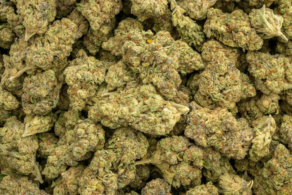 Visually, the buds are dense and chunky, encrusted in a thick layer of crystalline trichomes that shimmer in low light. Their coloration often features deep purples and forest greens, interlaced with bright amber pistils, and the resinous coating enhances their shadowy, frosted appeal.