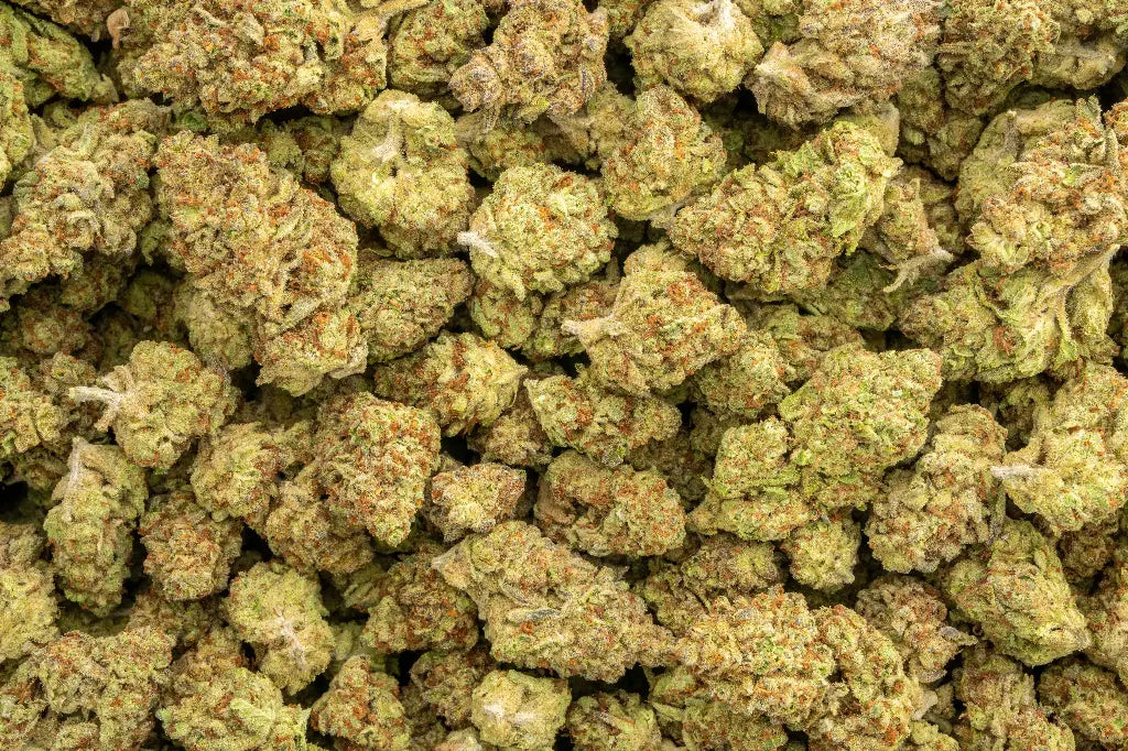 Visually, the buds are medium-dense and compact, covered in sticky frosty trichomes that enhance their appeal. Their coloration often features lime to forest greens accented with bright orange pistils, while the resinous coating adds a glossy finish.