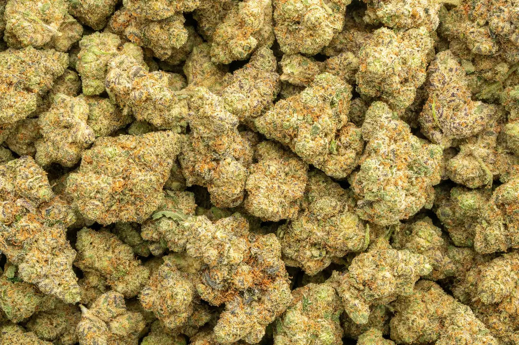 Visually, the buds are dense and chunky, cloaked in a thick blanket of milky-white and amber trichomes. Their coloration often presents forest greens with pale lime highlights, occasionally tinged with purple accents, and punctuated by bright orange pistils that weave throughout the colas.